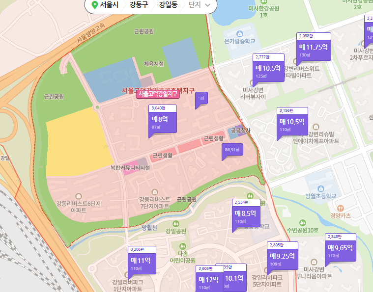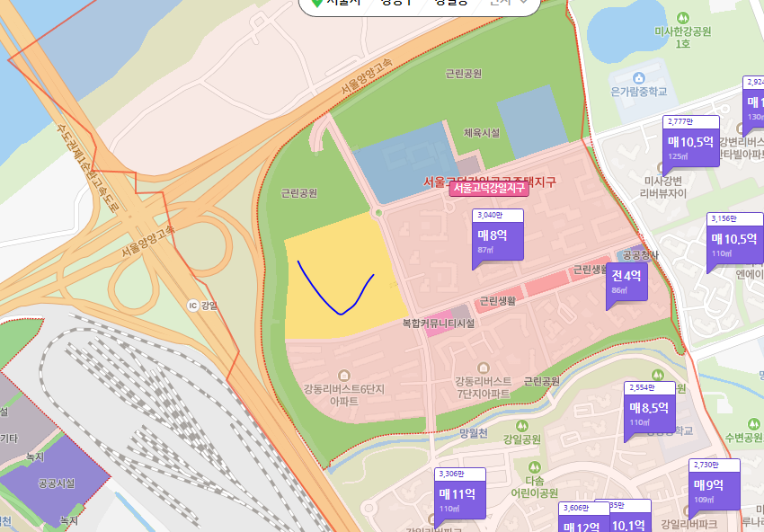 고덕강일3단지는 초,중학교가 바로 앞에 있고 주변에 공원도 형성돼어 있으며 한강변 입지 입니다.