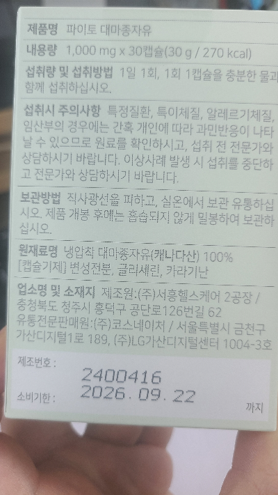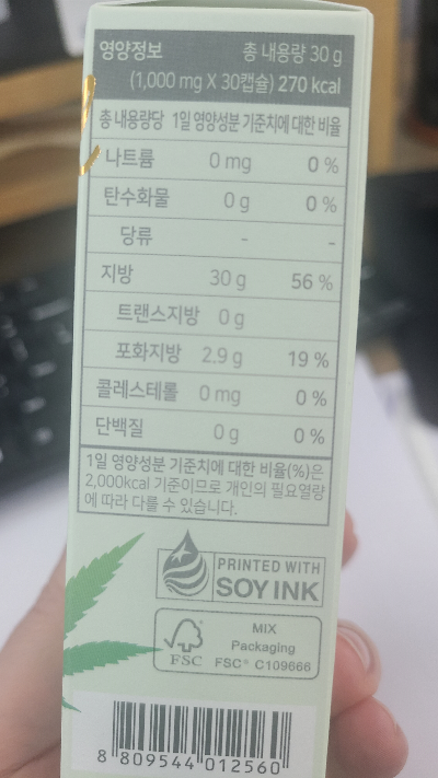 핵심 성분은 냉압착 대마종자유(캐나다산)이다.
