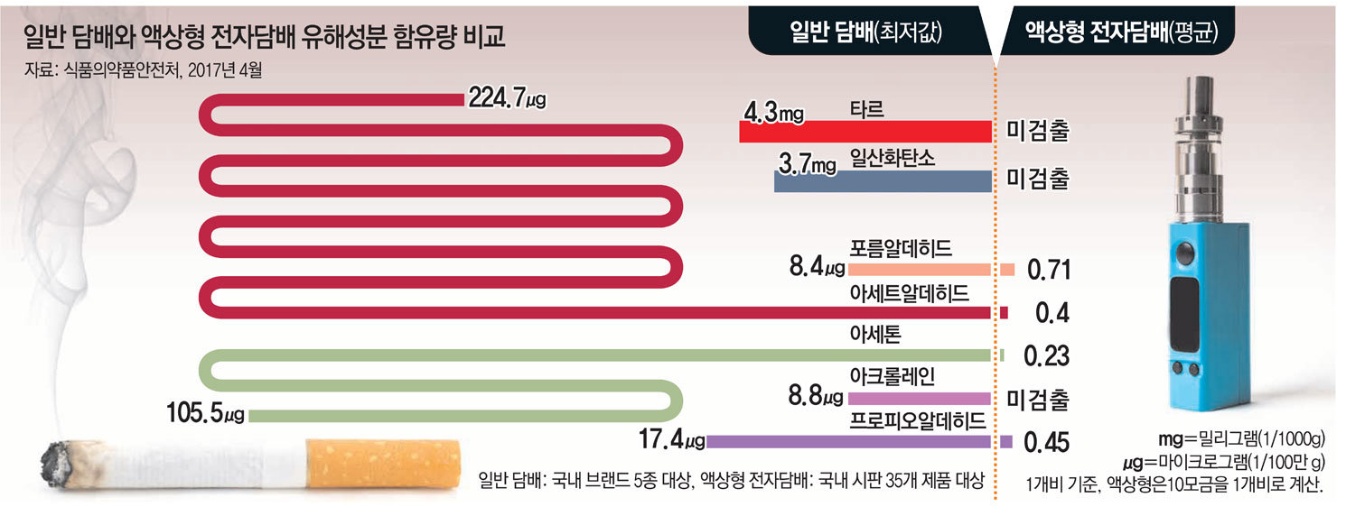 우선 액상형 전자담배의 경우 타르가 발생하지 않는다는점과 이 외 암을 유발하는 중대 성분이