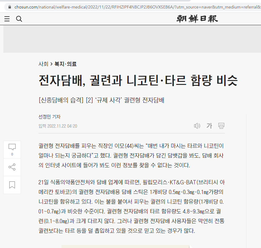 궐련형과 궐련형을 비교해 둘다 안좋다는 기사 내용