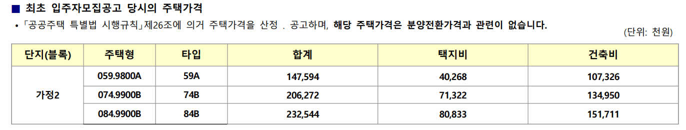 최초 입주자모집공고 당시 주택 가격 입니다.
