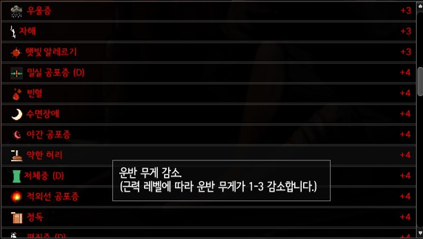 | 72 | 심한 저체중 | D | 체력-3 근접 데미지 40% 감소, 넘어질 확률 20% 증가 (65 시 저체중) | 10 |